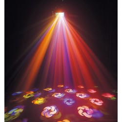 Caractéristiques techniques :- Lampe ELC 24V 250W- 1 roue de 18 gobos colorés- Prisme 3 facettes en verre dichroïque- Miroirs internes pour récupérer la totalité de la lumière- Grand angle de projection pour une plus grande surface d'exploitation- Fonctionnement sur le tempo via un micro intégré- Alimentation : 220V / 50 Hz- Dimensions : 340 x 340 x 135mm- Poids : 8,5 kg